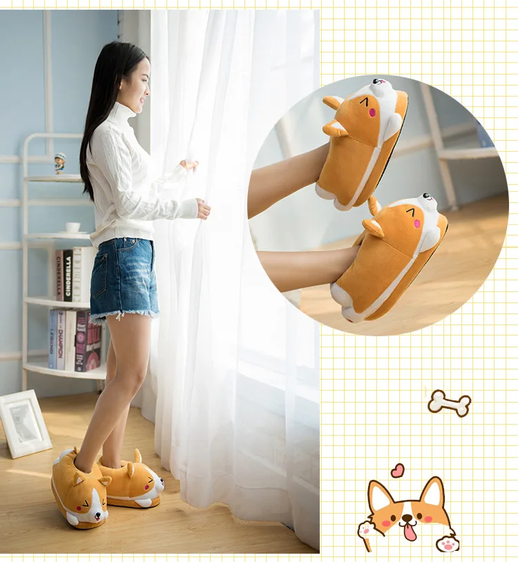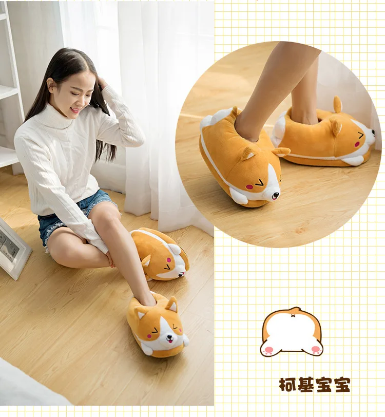 | Homen Slippers Female Winter Plush Corgi Slippers Warm Women Floor Indoor Shoes Cute Funny Adult Slippers Flat Zapatillas Woman |