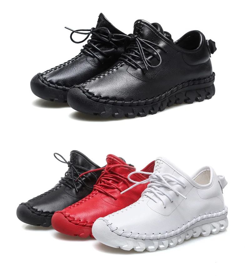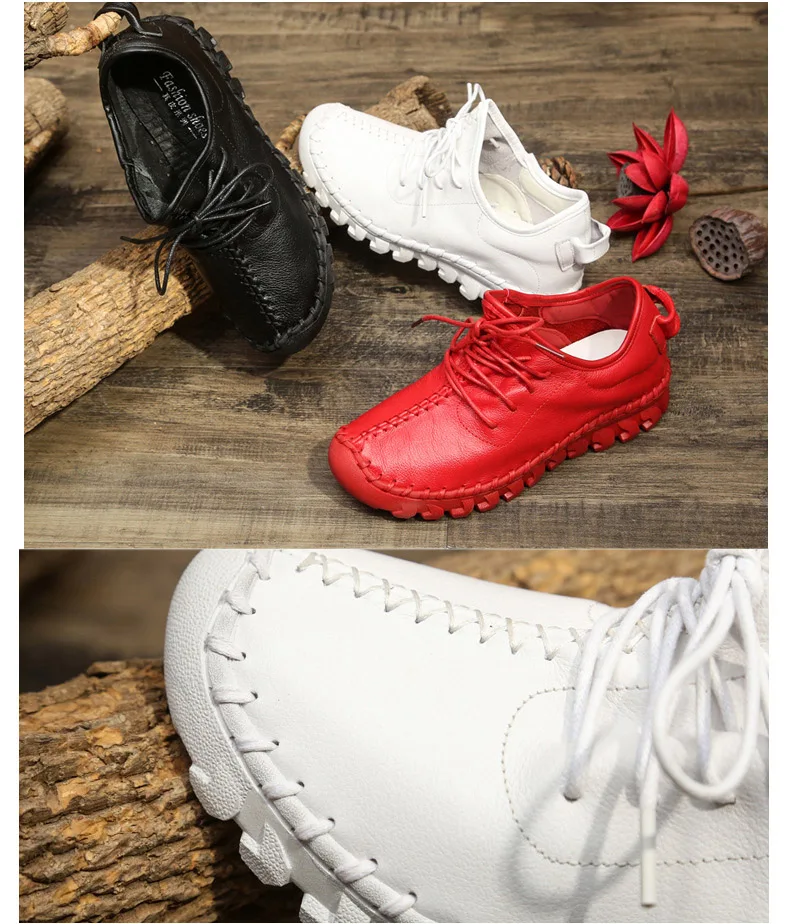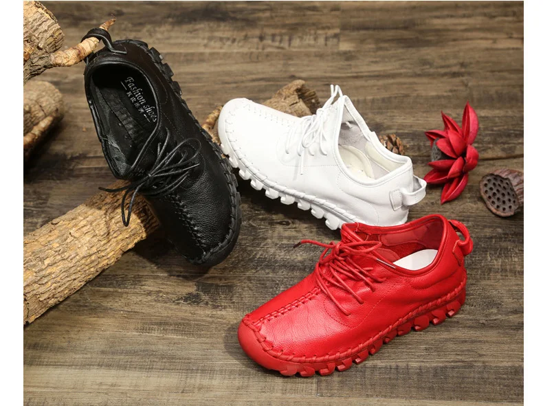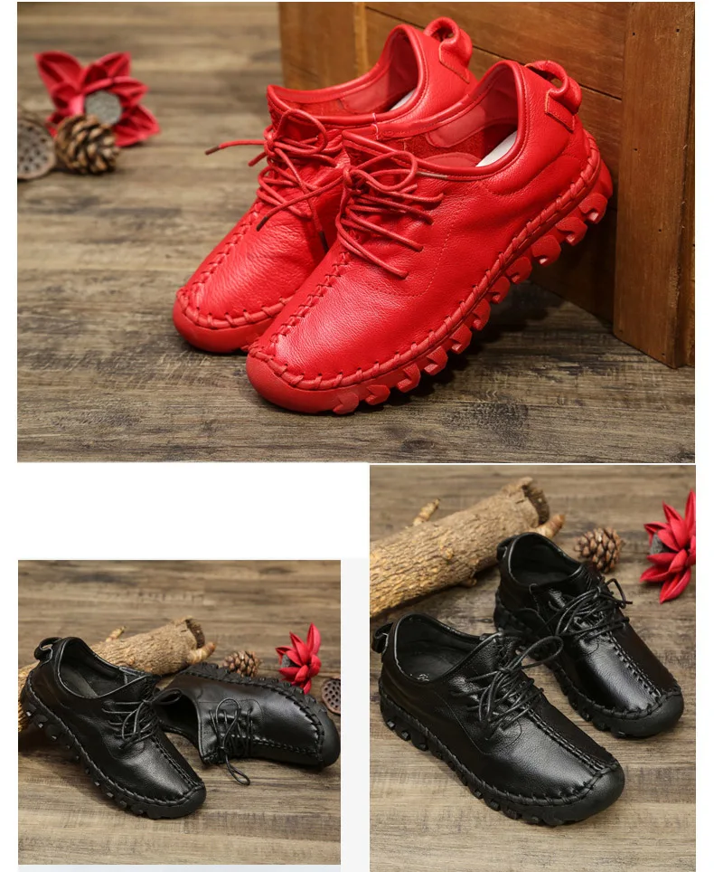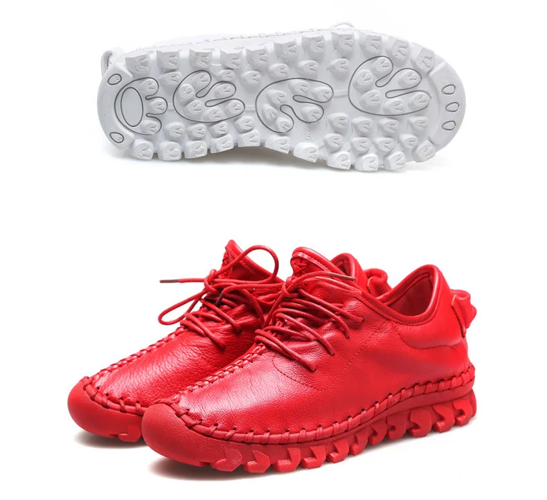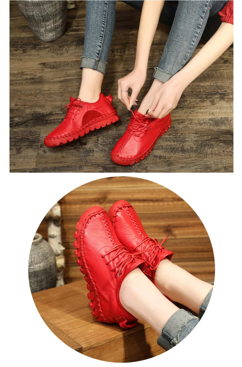 Handmade Genuine Leather Women Shoes Fashion Casual Sneakers Retro Flats Ladies Lacing Loafers Breathable Vulcanized Shoe Red 40