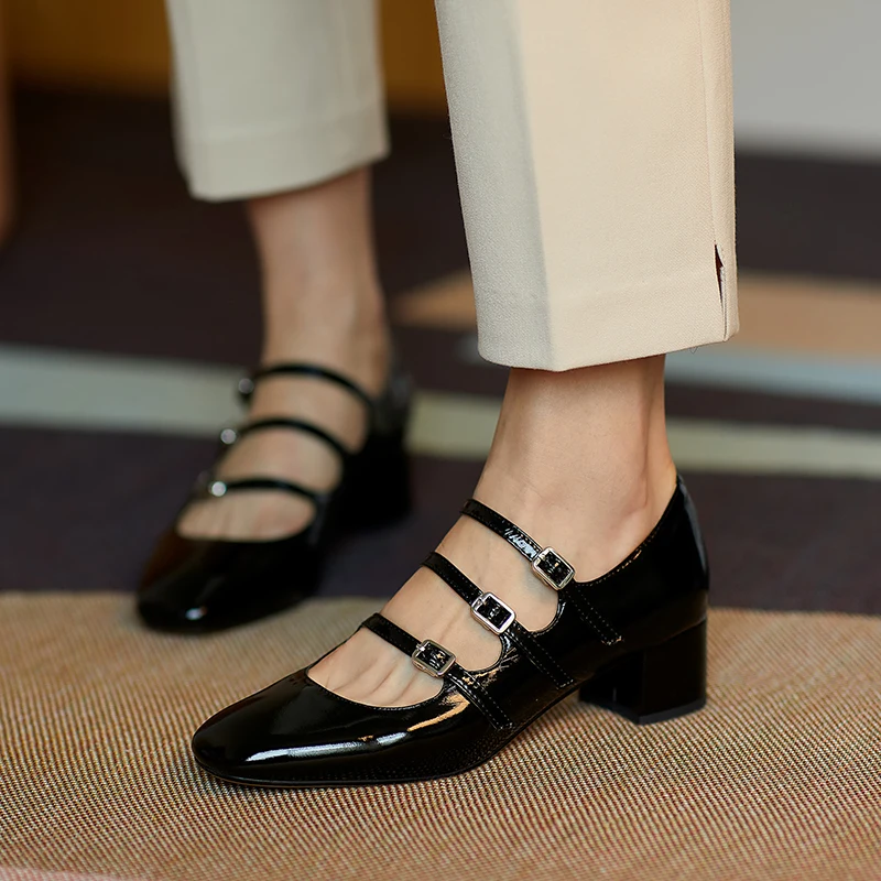 Plus Size 42 Women Patent Leather Dress Shoes Three Buckle Mary Janes Shoes Female Wedding Shoes Bridal Medium Heels Pumps 8244N