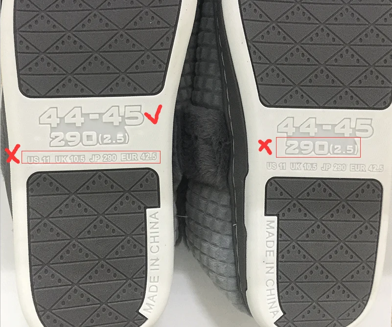 Dear friends, the soles of our shoes are based on Chinese sizes, not European sizes. As shown in the picture, what we marked × is the wrong size, and what we marked √ is the correct size. You will find that our form and our details are different between European and American sizes. Please don’t worry, please follow yours Choose the size for the foot length. For example, the US size is 10, the corresponding European size table is 44, but the sole of our details is shown as 42.5, and the sole is 44-45. If you want to buy these shoes, if you have any questions, you can consult our customer service, thank you.US size 3.5 =CN size 36/37=22.1-23.0 CM,US size 4 =CN size 36/37=22.1-23.0 CM,US size 4.5 =CN size 38/39=23.1-24.0 CM,US size 5.5 =CN size 38/39=23.1-24.0 CM,US size 6 =CN size 40/41=24.1-25.0 CM,US size 7 =CN size 40/41=24.1-25.0 CM,US size 7.5 =CN size 42/43=25.1-26.0 CM,US size 8.5 =CN size 42/43=25.1-26.0 CM,US size 9 =CN size 44/45=26.1-27.0 CM,US size 10 =CN size 44/45=26.1-27.0 CM,US size 11 =CN size 46/47=27.1-28.0 CM,US size 12 =CN size 46/47=27.1-28.0 CM,US size 13 =CN size 48/49=28.1-29.0 CM,US size 14 =CN size 48/49=28.1-29.0 CM,US size 15 =CN size 50/51=29.1-30.0 CM,US size 16 =CN size 50/51=29.1-30.0 CM,